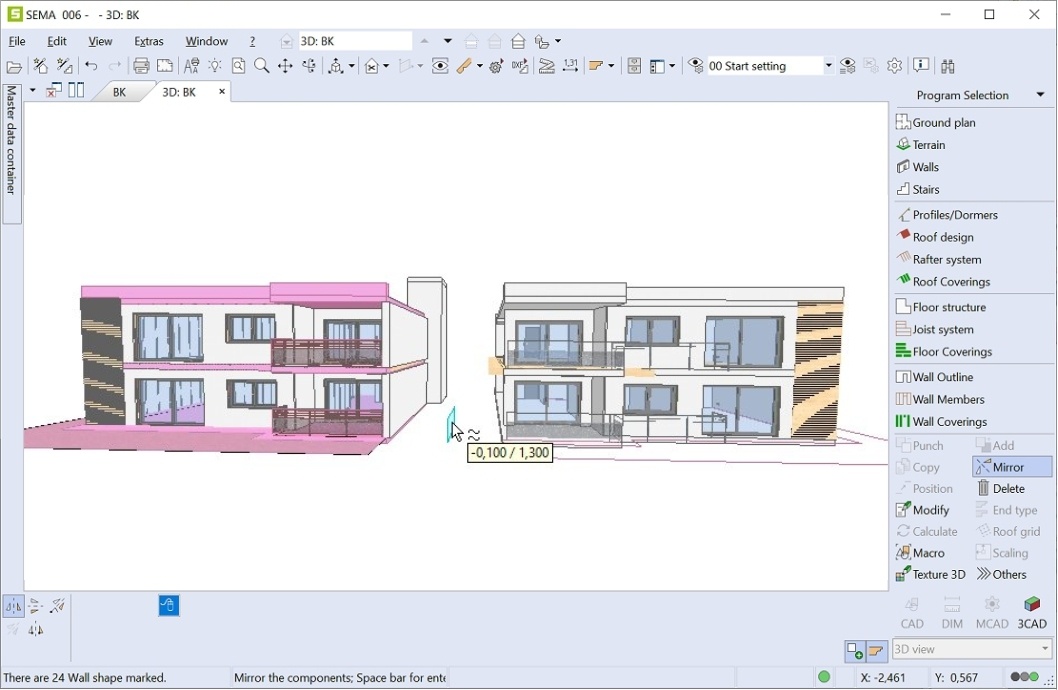 Solitamente nel SEMA-Software le pareti, le capriate, i solai ed i piani di costruzione non consistono solo in un profilo o in un corpo di volume. Tutti i piani di piastre che appartengono all'elemento, come anche le battute di finestre, porte e macro vengono specchiati correttamente, ovvero si gira l'orientamento. Si specchiano automaticamente anche tutti i legnami contenuti, gli oggetti CAD e l'intera quotatura. Con SEMA non serve più eseguire modifiche successive ai componenti specchiati e quindi si risparmia tempo prezioso.